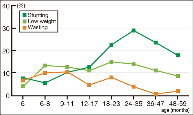 Malnutrition in infants being weaned at six months and up is a cause of delayed growth, with 10%–15% of those in the 6- to 11-month age group being underweight. Of toddlers in the 2- to 3-year age group, 30%–40% have stunting. Source: Ghana Health Service.