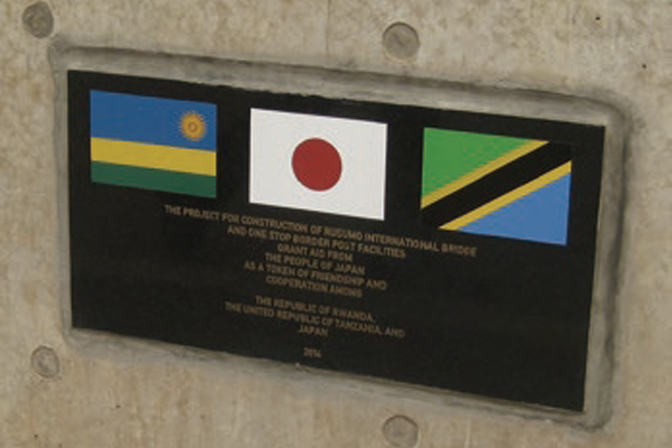 A commemorative panel at the approach to the bridge displays the flag of Japan along with those of Rwanda and Tanzania. Local university architecture students visited the site frequently to see the Japanese launching erection method used in constructing the bridge.