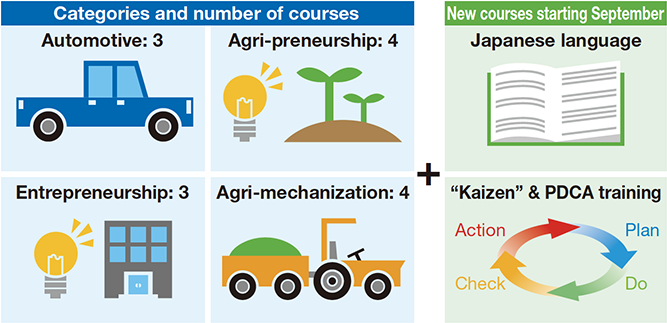 The Toyota Kenya Academy offers courses in four major areas. In addition to courses that the previous center had been offering to technicians in the automotive field, the academy has been receiving cooperation from the Japan International Cooperation Agency (JICA) and Kenyan government organs in providing courses in entrepreneurship, agri-preneurship, and agri-mechanization. In the two years following its opening in 2014, 381 students have taken courses at the academy, and this September it plans to launch courses on Toyota’s “Kaizen” process of workers onsite continuously brainstorming ideas to improve productivity and on the “plan, do, check, act” (PDCA) management cycle.