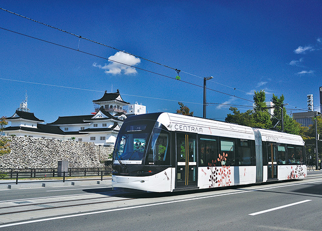 A tram runs along the Centram loop line of Toyama’s light rail transit (LRT) system; in the background is Toyama Castle, the city’s symbol. Toyama is promoting use of LRT by distributing free-ride tickets at hotels within the city to tourists from abroad who spend the night there.