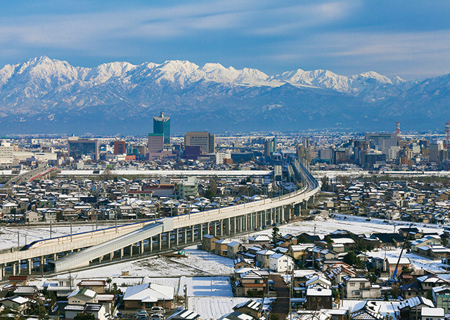 A view of Toyama’s urban center, including Toyama Station of the Hokuriku Shinkansen, against the backdrop the Tateyama Mountain Range towering around 3,000 meters in the distance.