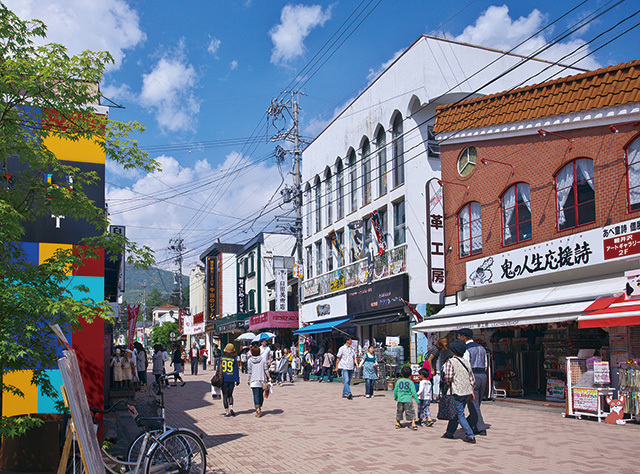 Kyu- Karuizawa Ginza is lined with shops selling crafts like Karuizawa- bori carving and foods like jam and highland vegetables.