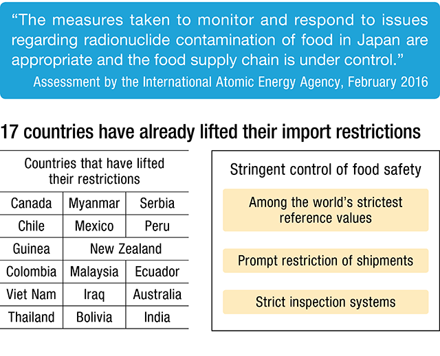 There are still issues to address, of course. Some countries continue to restrict imports of Japanese agricultural products, citing concerns about radioactive materials in the wake of the March 2011 disaster. But thanks to concerted efforts through scientific research to show the safety of Japanese food, these obstacles are being dismantled as time goes on. The European Union, for example, dramatically relaxed its restrictions in January 2016. We are having quarantine consultation with other countries to make more people in the world enjoy Japanese excellent foods. As this progress continues steadily, conditions will ripen for more and more people around the world to get a taste of the high-quality agricultural produce and food products that Japan has to offer.