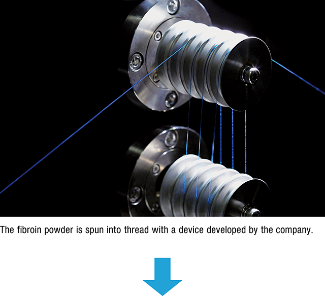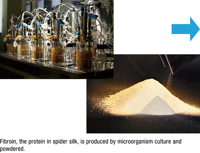 Kazuhide Sekiyama, Spiber’s representative executive officer, founded the company in 2007, using a blend of “spider” and “fiber” for its name. His team succeeded in determining the genetic sequence of fibroin (the protein that is the main component of spider silk), synthesizing the relevant DNA, and incorporating it into microorganisms. They also developed techniques to culture the microorganisms quickly in large amounts and to collect the fibroin they produce. The protein is powdered and then fused into thread using a special device.
