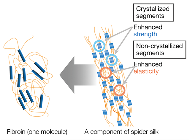 The molecular structure of fibroin is divided into hard crystallized segments and soft non-crystallized segments. This structure is thought to be related to the combination of strength and elasticity.