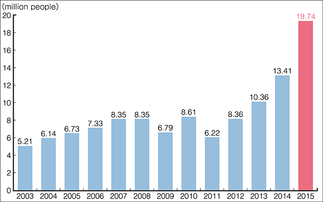 The number of tourists visiting Japan has been rapidly increasing. In 2015 inbound tourists totaled 19.74 million, double the figure for 2013. A number of factors are seen as contributing to this growth, such as the depreciation of the yen, relaxation of visa requirements, and increased affluence in neighboring countries. The trend seems likely to continue.