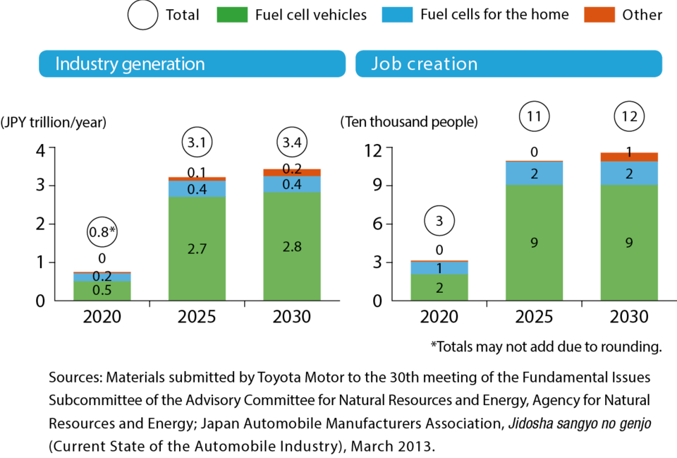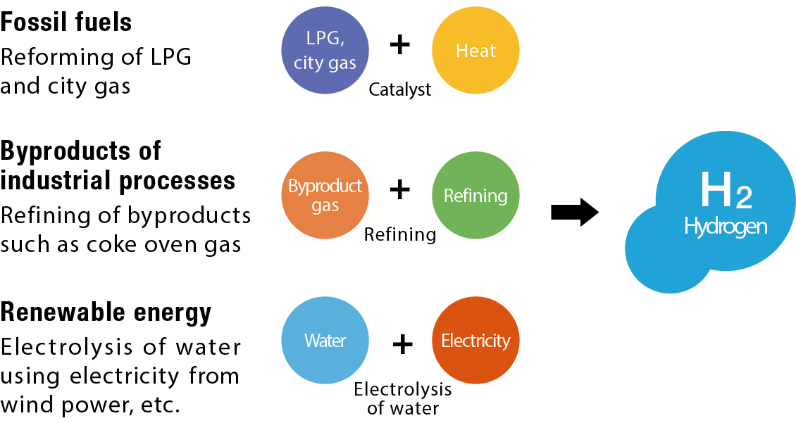 The creation of a hydrogen society aims at achieving four major objectives. First is the reduction of the burden on the environment. Unlike fossil fuels, hydrogen emits only water when burned. So it promises to greatly cut emissions of carbon dioxide. Second is the diversification of energy sources. Hydrogen can be produced with renewable energy sources, and its use will also promote stability in the supply of energy. Third, it will generate beneficial economic ripple effects. The shift to a new energy source will naturally mean new demand and new jobs. And fourth, it can help in coping with natural disasters. Fuel cell cars generate electricity to power their motors using hydrogen from their tanks, and when disasters cause power outages, these vehicles can serve as large-scale movable generators. This adds to the appeal of hydrogen for Tokyo, which is highly conscious of the importance of disaster readiness.