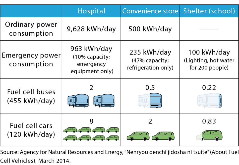 Numbers of fuel cell buses or cars required to provide one day's emergency power