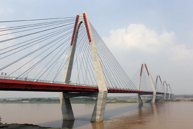 Beautifully designed pylons support the Nhat Tan Bridge, which has a total length of 3,755 meters (4,100 yards). The total construction cost was JPY 75 billion (USD 714 million), of which 72% was met with ODA loans. The structure, also known as the Viet Nam—Japan Friendship Bridge, is a symbol of the warm ties between the two nations.