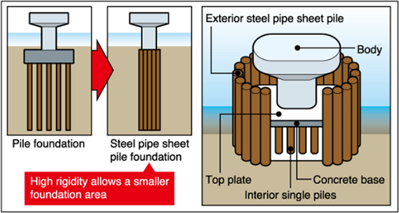 Improvements to airport access proceeded at the same time as expansion of the airport facilities. The Nhat Tan Bridge, which was completed in January 2015 with ODA from Japan, functions as a vital link in airport access. The bridge has now become a landmark in Hanoi. A construction method developed in Japan was used for the bridge foundations. Steel pipe sheet piles were driven in a cylindrical well shape to create the foundations for the pylons that support the bridge. This method suits soft ground such as that in Viet Nam and makes the bridge more resistant to earthquakes.