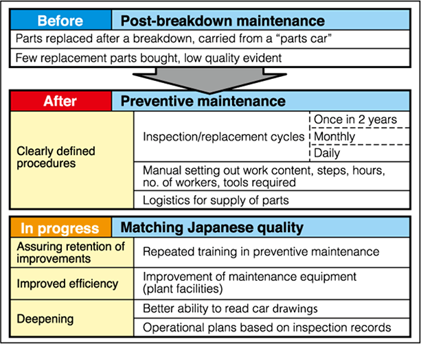 Maeda acted as a bridge between management and employees on the front lines, and he conveyed the maintenance methods and procedures used in Japan. Through these efforts he supported the drafting of a new maintenance manual. The standardization and rationalization of worksite procedures resulted in a marked reduction in the number of railway car malfunctions.