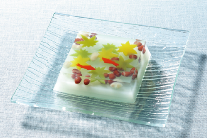 The basic ingredient is agar, or kanten , a tasteless substance made from algae. Taking advantage of the substanceʼs transparency, confectioners fashion tiny scenes of goldfish, sweetfish, green maple leaves, stars, and other natural objects associated with summer—carefully crafted from sweet bean paste (an) or jellied bean paste (yokan)—floating in cool water or a clear sky. Appealing to the eye as well as to the palate, these creations masterfully evoke the charm of summertime in Japan.