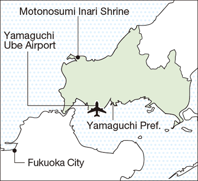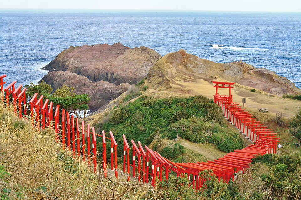 Nagato City in Yamaguchi Prefecture is situated about 100 minutes by car north of Yamaguchi Ube Airport. The Motonosumi Inari Shrine stands on a cliff facing the Sea of Japan and the entrance path to the shrine continues for more than 100 meters (330 feet) with 123 bright red torii (traditional shrine gates) set along it in an orderly manner.