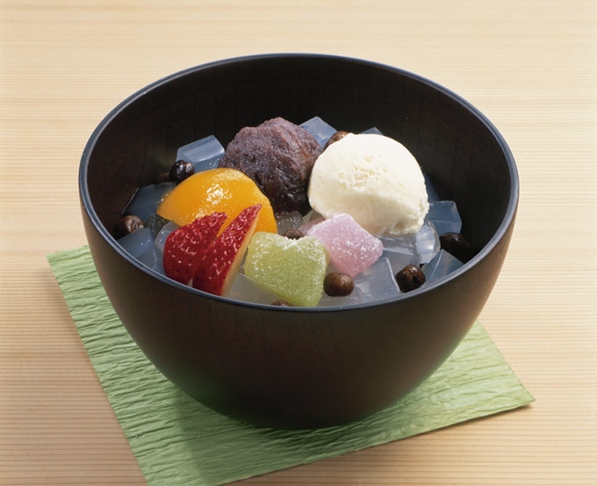 Anmitsu is a traditional Japanese treat usually eaten as a snack between meals. As you can see in the photo, the main component is an , a sweet bean paste made from adzuki beans, accompanied by jelly cubes, ice cream, fresh fruit, and so on. The result is a refreshing bowl of goodness. This makes anmitsu popular among Japanese people of all ages and from all walks of life. Be sure to give it a try when you visit Japan—we’re sure you’ll love it too.