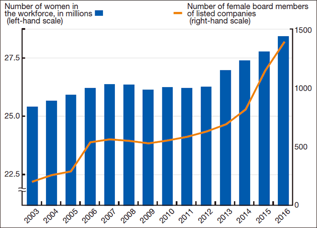 In Japan, the number of women in the workforce grew by 1.5 million people between 2012 and 2016. The number of female board members also doubled during that time.