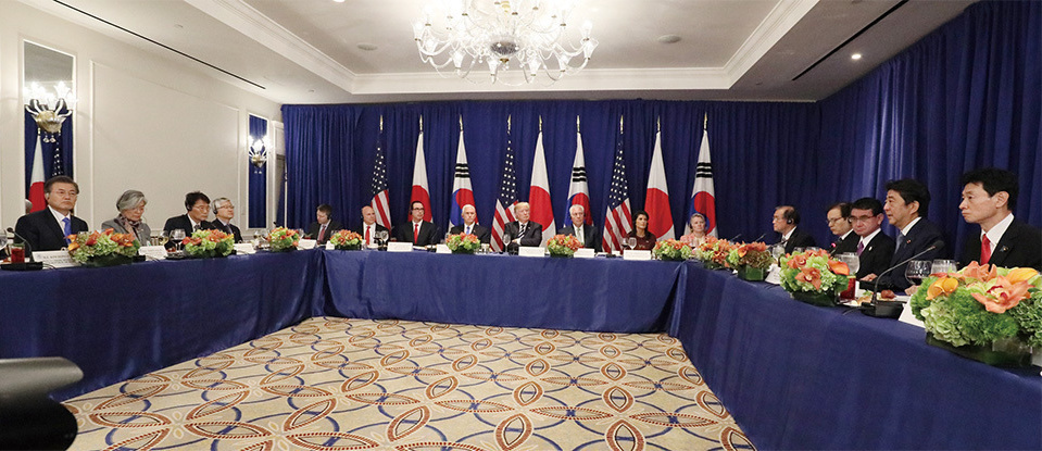 Meeting with the Honorable Donald J. Trump, President of the United States of America, and H.E. Mr. Moon Jae-in, President of the Republic of Korea, in New York. The three countries’ leaders shared the view that amid the growing threat of North Korea, they must deepen collaboration under the unity of the three countries, such as by increasing efforts to encourage joint pressure from the international community. (September 2017)