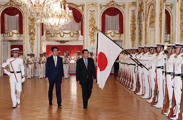 Holding a summit meeting with Samdech Akka Moha Sena Padei Techo Hun Sen, Prime Minister of the Kingdom of Cambodia, at the Akasaka State Guest House. (August 2017)