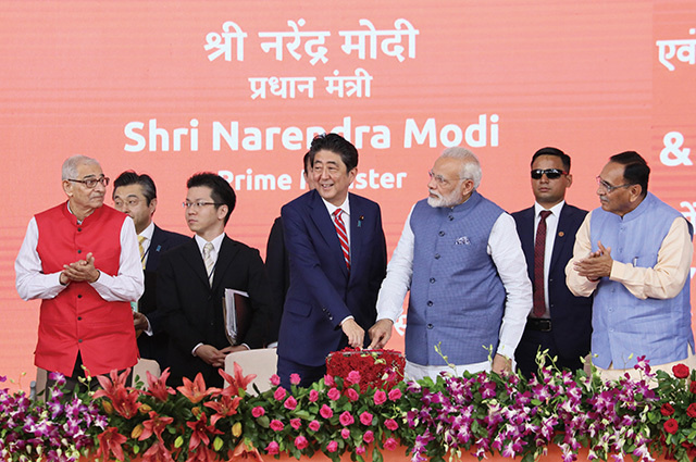 Visiting Ahmedabad, India, where he attended the ground-breaking ceremony for India’s high-speed rail project with H.E. Mr. Narendra Modi, Prime Minister of India. A Japanese Shinkansen system is being adopted as India’s first high-speed rail, which will be constructed between Ahmedabad and the city of Mumbai. (September 2017)