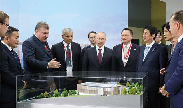Attending the ground-breaking ceremony for an international judo center in Vladivostok, the Russian Federation, with President Vladimir Putin of the Russian Federation. Also in attendance was Yasuhiro Yamashita, president of the All Japan Judo Federation (pictured to the left of Prime Minister Abe). (September 2017)