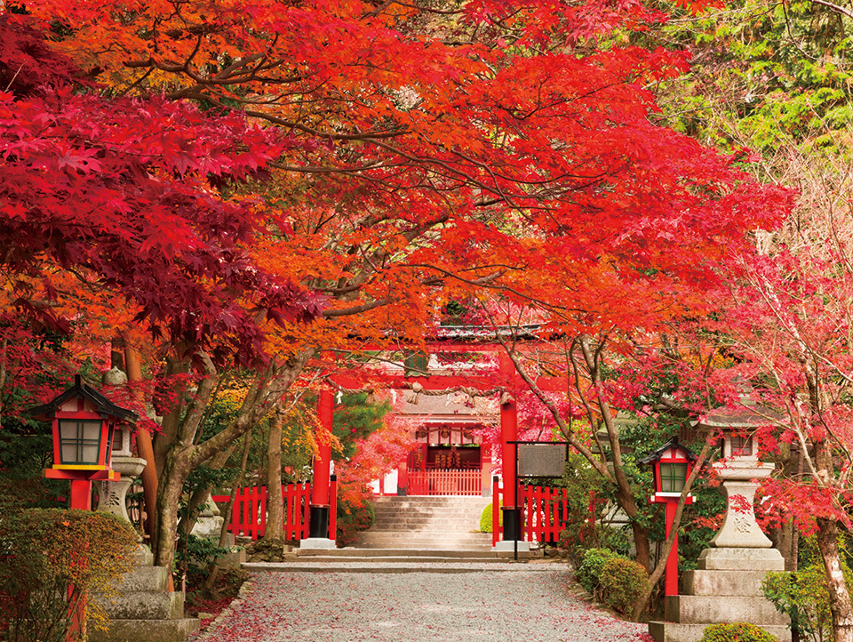 Nagaoka-kyo served as the capital for just ten years, but the shrine has long been revered since then. The bold elegance of the vermillion lacquered torii gates and shrine buildings is repeated in the bright crimson leaves.