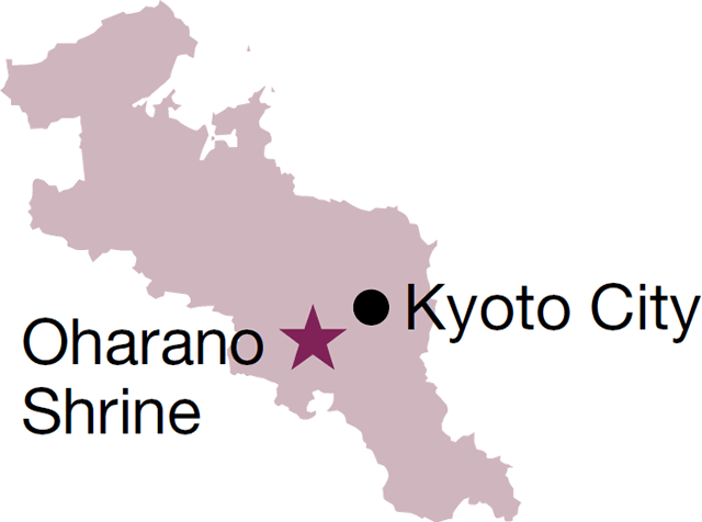 At the foot of a mountain southwest of Kyoto City quietly sits the grand Oharano Shrine, which was built to enshrine gods when this region became the nation’s new capital under the name Nagaoka-kyo in 784.