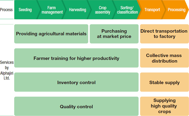 In February 2016, Yakushigawa established Alphajiri Ltd. together with three Kenyan supporters as an organization to link farmers with the processing manufacturers and to build a soybean supply chain. Alphajiri Ltd. makes contracts with farmers and comprehensively manages their business transactions. This includes purchasing soybeans produced by the farmers at fair prices, selling them to the processing manufacturers, and everything in between. In addition, to increase harvest output and improve the supply volume of individual farmers, the company loans seeds, fertilizer, etc. and provides technical guidance. To ensure that the farmers receive instructions and advice in a timely manner, the company appoints a field officer in each village. After acquiring cultivation know-how from Alphajiri employees, the field officer makes rounds of a village on bicycle and provides immediate help where it's needed. For example, if the officer finds harvested soybeans exposed to rain, the officer will instruct the farmer on covering the harvest with tarpaulin sheets. It's a detail-oriented system that truly employs the Japanese philosophy of "Kaizen," the pursuit of continuous improvement.