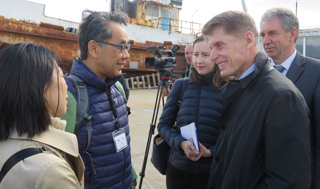 Based on the agreements reached between Prime Minister Abe and President Putin in December of last year and April of this year, a 69-member research team which included government officials as well as specialists from the private sector visited the Four Northern Islands from June 27 to July 1. The purpose of the visit was to study the potential of joint economic activities in those islands, and the team visited sites related to project proposals both from Japan and Russia. As they traveled to each island, the team members met with the governor of the Sakhalin region, Oleg Kozhemyako, and enjoyed a warm reception from the island residents while visiting sites related to fisheries, sightseeing, infrastructure and energy, medical care, and daily living.