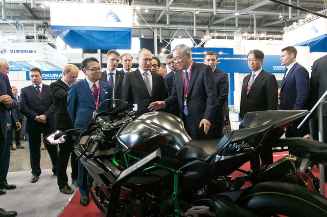 President Putin toured the Japan Pavilion. Kawasaki Heavy Industries Chairman Shigeru Murayama explains his company’s motorcycle technology and other subjects.