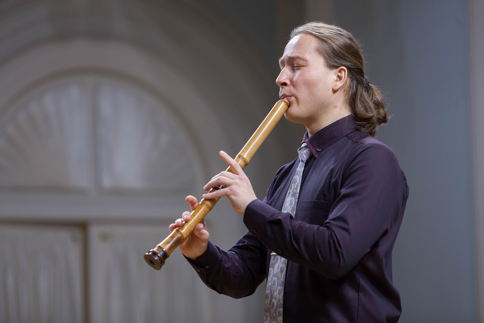 Playing the shakuhachi at Rachmaninoff Hall, Tchaikovsky Moscow State Conservatory, in December 2016.