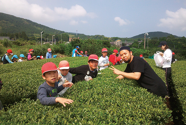 Enjoying the experience of picking and roasting green-tea leaves with local elementary school students.