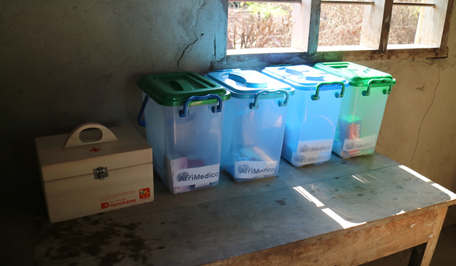 AfriMedico’s okigusuri set consists of approximately 10 different medicine products. In addition to an analgesic and gastrointestinal agent, the kit contains insect repellant and a malaria testing kit to combat malaria.