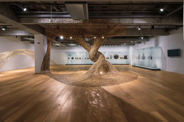 The exhibition and multi-purpose space is the center of Japan House São Paulo. Here, an exhibition aiming to deepen understanding of Japanese culture is held once every few months, with a different theme each time. The theme of the first exhibit was “bamboo.” From large art installations to traditional handicraft products that fit in the hand, a wide variety of art works made from bamboo were put on display at the venue. Of particular note is an installation by bamboo artist Chiku’unsai IV Tanabe using toratake bamboo, which has drawn so much attention that it was featured on the front page of a major local newspaper.