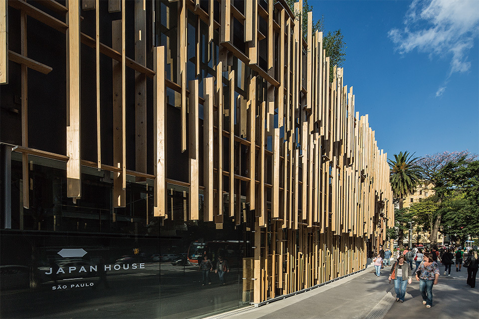 “Japan House São Paulo” faces Paulista Avenue in São Paulo. With a Japanese cedar exterior, the facility’s design was supervised by world-renowned architect Kengo Kuma.