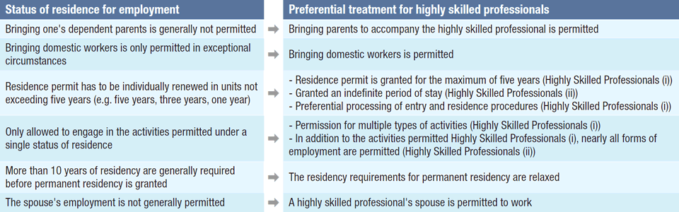 *Points are awarded based on educational and professional career history, yearly salary, and other factors, and a total of 70 points or more permits categorization as a Highly Skilled Professional (i). Highly Skilled Professionals (i) who have engaged in activities as such for at least three years can become Highly Skilled Professionals (ii).