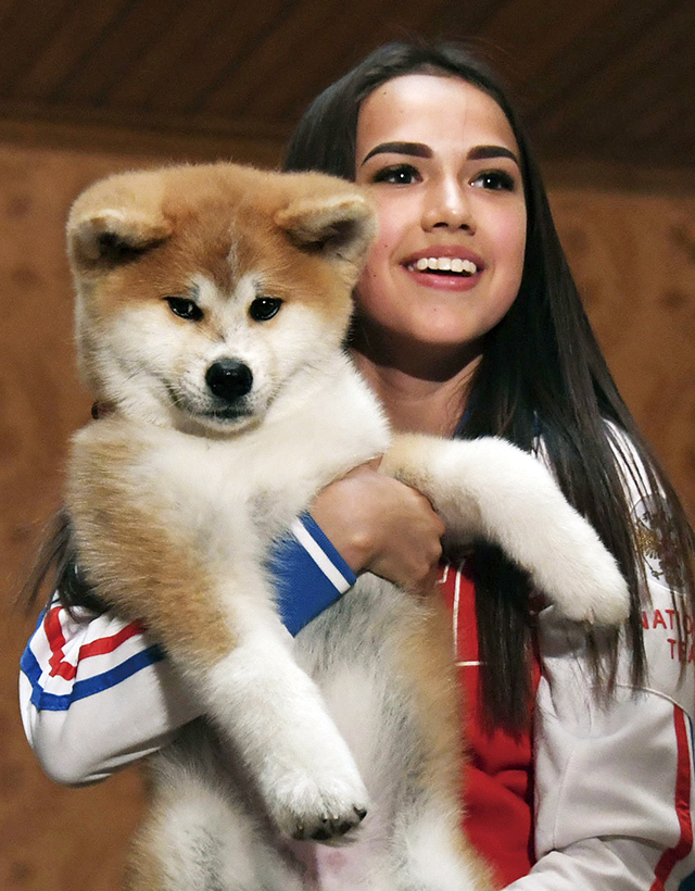 Alina Zagitova received an Akita dog in Moscow, while Prime Minister Abe visited the city to see President Putin. (May 2018)