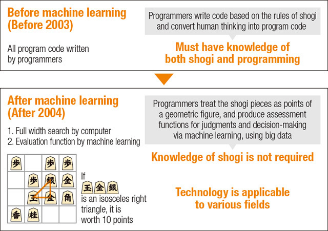 The shogi AI can think of moves outside the range of human thinking. These moves are based on computed evaluation scores which the AI has learned from big data. This method does not rely on shogi’s rules, and can be applied to various fields.