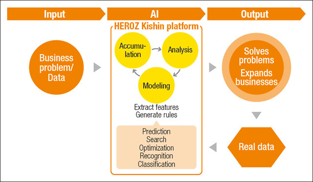 HEROZ Kishin solves various types of problems by accumulating real data as big data, and analyzing and modeling it. It also improves the accuracy through continuous learning.