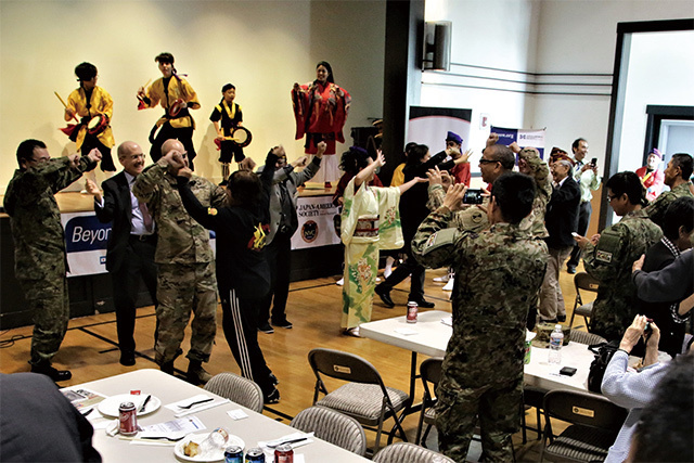 Japan Ground Self-Defense Force personnel and JUMP members enjoy a traditional dance performed by members of the Okinawa Prefecture Citizens’ Association.