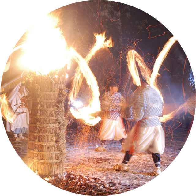 A festival known as Shoreisai is held on Mt. Haguro beginning on the final day of the year and runs all throughout New Year’s Eve into New Year’s Day. Two Shugendo practitioners known as matsuhijiri, who have completed ascetic practices over a period of 100 days, lead the festival. The festival has its origin in ancient times, when fires were lit to drive out harmful insects that were damaging the village’s farm products. During the festival, effigies of these harmful insects in the form of giant torches are burned down to pray for a rich harvest and ward off bad fortune in the new year. The flames burning atop the snow create an otherworldly spectacle at night.