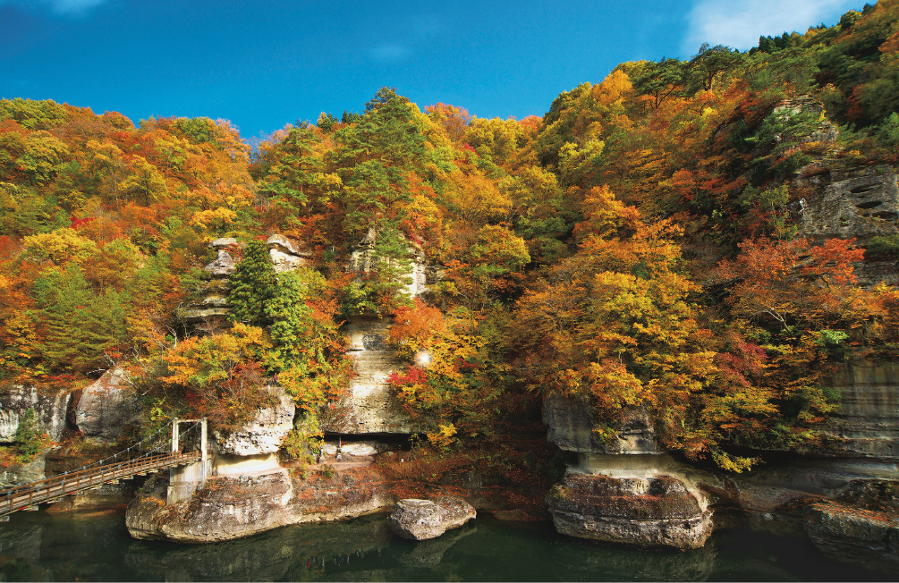 Weathered and worn over a million years, the Tō-no-Hetsturi, which runs along the sides of a ravine in Shimogo town, Fukushima Prefecture, strikes a marvelous sight that resembles rows of white towers. Hetsuri is an old local term meaning steep riverside cliffs, while tō means tower in Japanese. In autumn, the precipices become speckled with variously-colored autumn leaves and look quite picturesque. An up-close experience with such magnificent nature awaits those who cross over the suspension bridge and walk within the sheer cliffs.