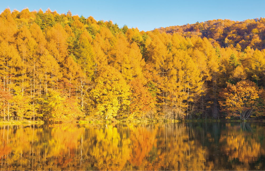 There lies a mystic pond in the woods of one of Japan’s premier upland resorts in the Tateshina Highlands of Chino, Nagano Prefecture. The body of water, found at an elevation of 1,500 meters, is Mishaka Pond, whose name comes from its association with traditional religious rituals. The pond is also notable for a cold, acidic mineral spring that pours in water. That makes the pond uninhabitable for fish, which is why the water is so incredibly clear. The surface acts like a mirror, reflecting the larch trees lining the shore to produce a sight of divine beauty. That spectacle captivated a great Japanese painter who made the pond a motif in one of his most esteemed works. In autumn, the tranquil pond shines with a golden brilliance.