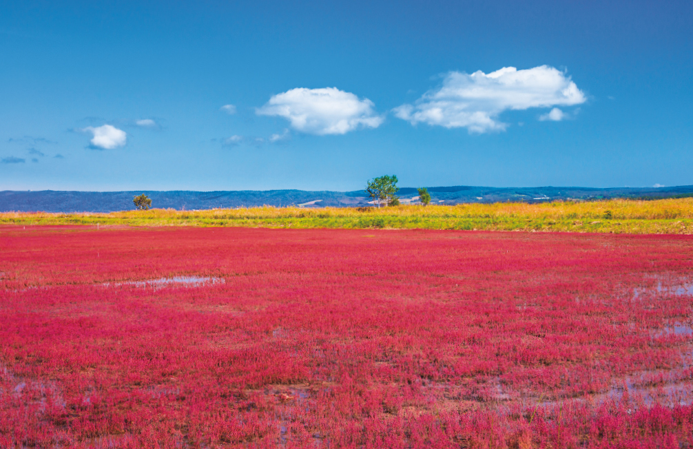 Abashiri, a city in northeastern Hokkaido, faces the Sea of Okhotsk. There you can take in a vast blanket of vivid red glasswort covering the salt marsh along Lake Notoro, a lagoon where the seawater seeps in. When autumn comes, the flowering plants’ stems turn red, seemingly painting the ground with a scarlet brush. The contrast between the carpet of red glasswort and the blue sky stretching out into the distance is simply stunning. A wooden walking path allows visitors to stroll through this crimson sea.