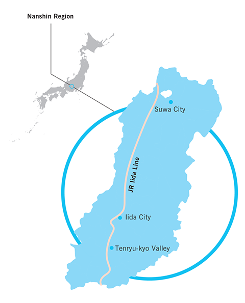 The local JR Iida Line runs north to south through the Nanshin Region. Out the windows, passengers not only can enjoy the beautiful rural scenery, but also a stunning expanse of mountains and gorges. In addition, they can enjoy unexplored regions such a station that stands on the edge of a mountain cliff and a station that can only be accessed via a suspension bridge.