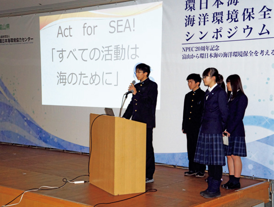 On January 20, 2019, a symposium was held on the theme of “Protection of the Marine Environment of the Japanese Sea Area, from the Perspective of Toyama.” The program included a keynote presentation by a specialist in marine litter countermeasures, as well as research findings presented by local high school students. Misao Aibe, assistant director of the Planning & International Cooperation Division of the NPEC, commented, “Having surveyed the coast and seen the actual situation for themselves, the high school students showed a deep understanding of the problems we face. We’re hoping that more people will become aware of the importance of preserving the marine environment, and get involved in protecting the beauty of Toyama Bay.”
