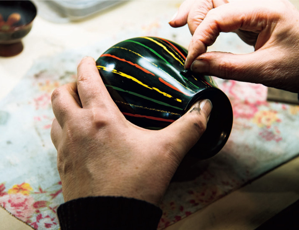 While still an art-school student in London, 19-year-old Ross visited an exhibition at the Royal Academy of Arts and fell in love with a deep black and beautifully inlaid urushi inkstone box. “I want to study urushi!” an inspired Ross resolved, and she left for Japan on a one-way ticket. “I naively thought I would master it in about three months and return to England,” she recalls, but the unfathomable depths of urushi have been captivating her for more than 35 years. Among Japan’s urushi production regions, Wajima City, where Ross has studios and a gallery, has a reputation for the highest quality pieces, which are called the “Urushi no Jo-oh (Queen of Urushi).”
