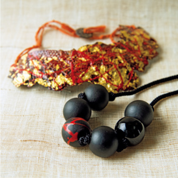 “This urushi accessory is one of my contemporary works. Each bead expresses a different quality: matte, shiny, and textured.” Other examples are a bowl decorated with lace soaked in urushi, and a plate appearing metallic because of silver powder sprinkled over the urushi, a technique called maki-e. “Urushi’s range of expression is infinite,” says Ross.