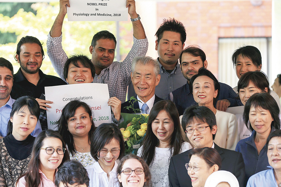 At Kyoto University, Dr. Honjo smiles in the company of students and researchers overjoyed at the news about his winning the Nobel Prize.