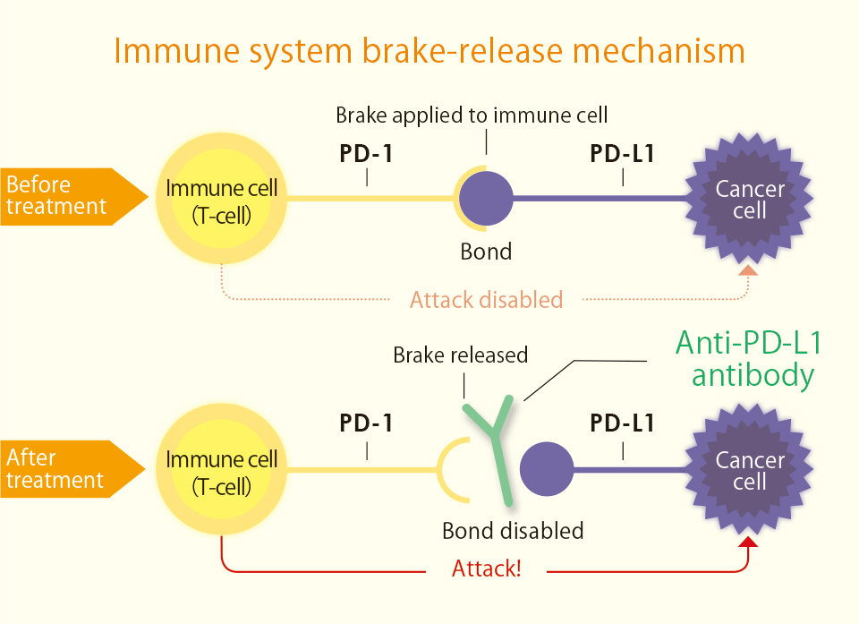 An “anti-PD-L1 antibody,” developed according to this method, can release the brake, allowing the T-cell to resume its attack on cancer cells.
