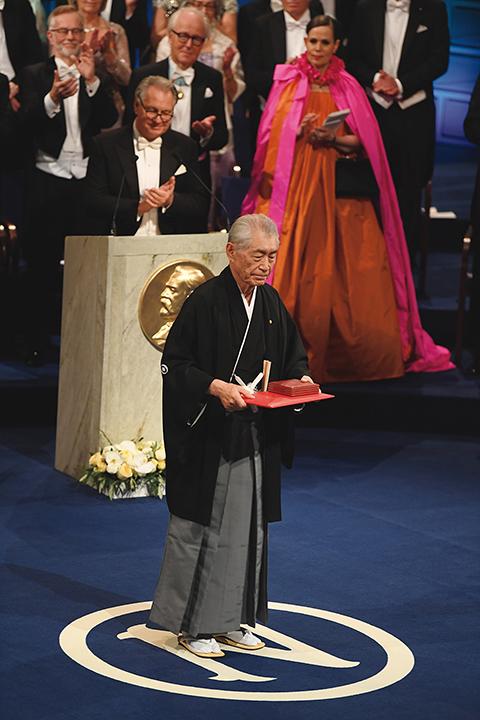 Dr. Honjo attending the Nobel Prize Award Ceremony (Stockholm, December 2018) dressed in traditional Japanese formal attire consisting of a haori jacket and trouser-like hakama.