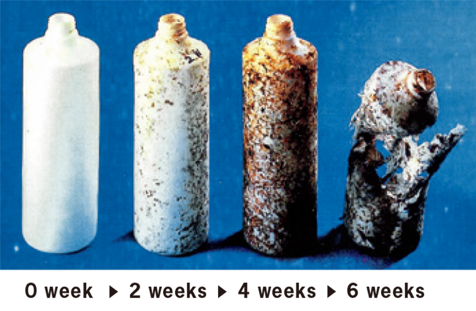State of biodegradation under composting conditions for two, four and six weeks. Photo courtesy of Japan BioPlastics Association.